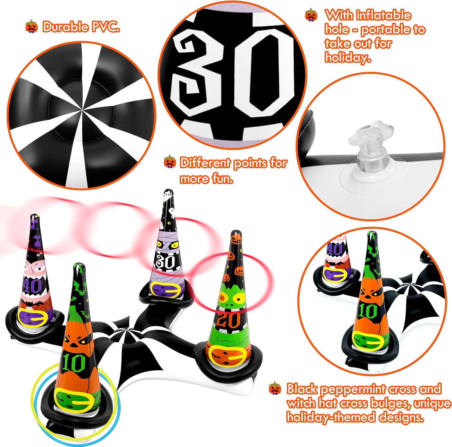 - Halloween ring toss game: Includes one inflatable witch hat and eight colorful rings in three different sizes. Make your Halloween party unforgettable with this fun game throughout October!